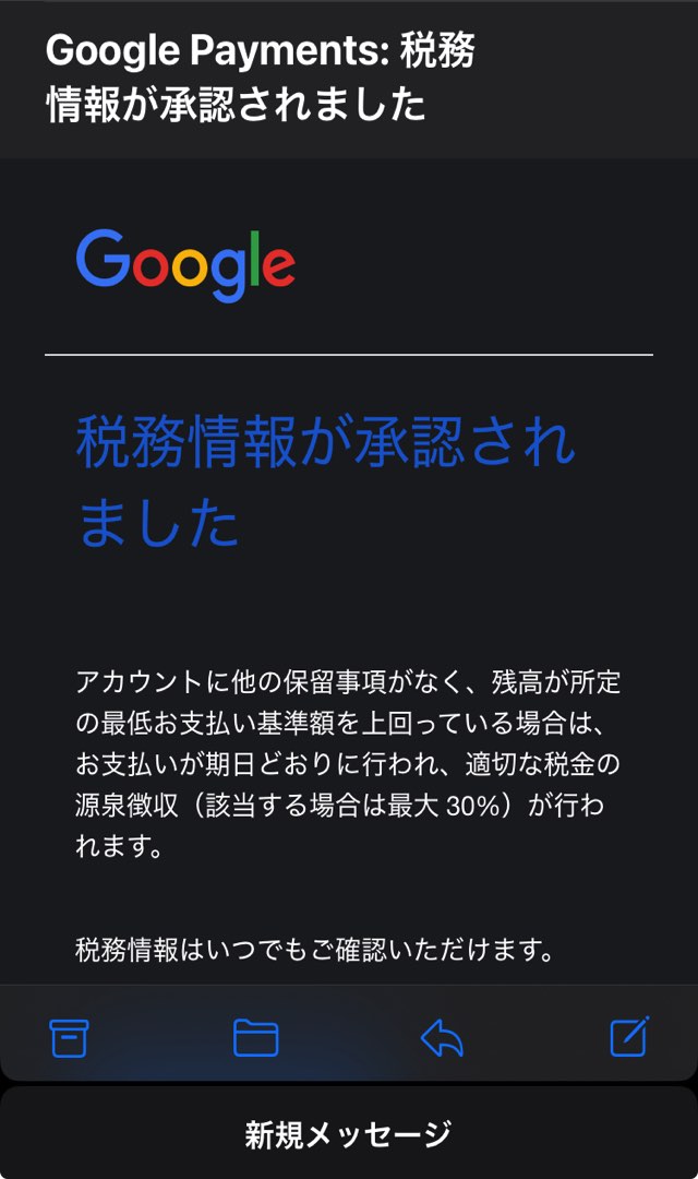 まず最低収益取得のお知らせ、および税務情報を済ませるようGoogleからこのような通知が届きます。