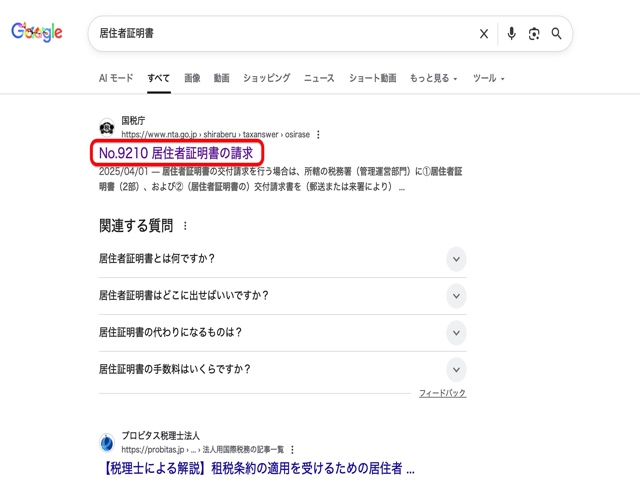 まずは「居住者証明書」と検索をかける