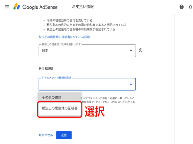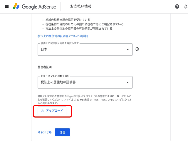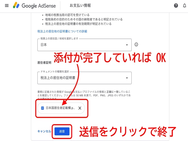 下の画像では事前に用意しておいた「居住者証明書」のPDFなどのファイルをアップロード(添付)しましょう